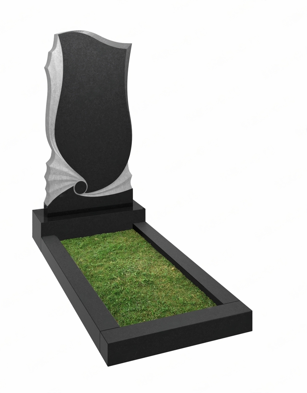 Памятник на могилу В-58 с волнистой стелой, темного цвета со светлым декором ниспадающим с левой стороны и собирающимся в элегантный пояс. Выполняется из разных видов гранита, желательно при выборе материала отдать предпочтение камню габбро-диабаз